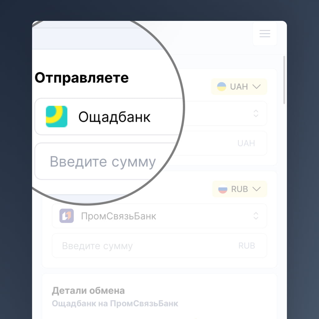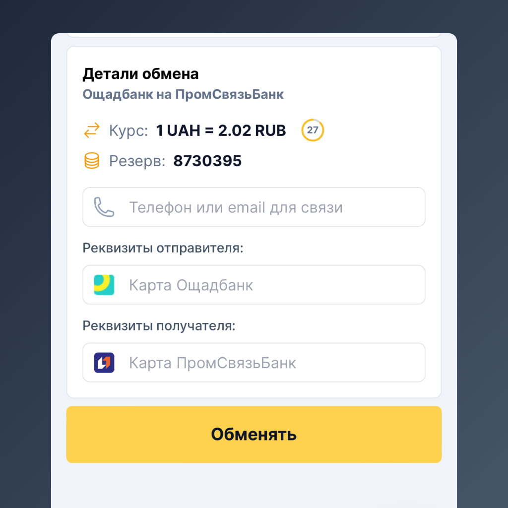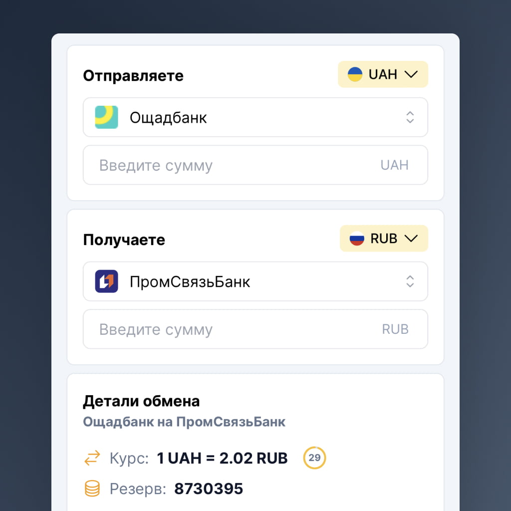 Неважно, в Киеве вы или в Донецке, в Кропивницком или Торезе, в России или Европе. Наш сервис помогает обменивать и переводить деньги легко и без границ.