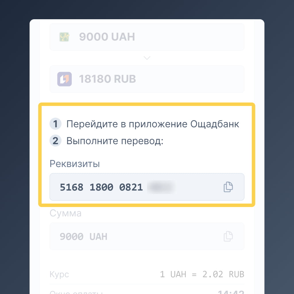 Вы увидите номер нашей карты украинского банка, на которую нужно сделать перевод.
